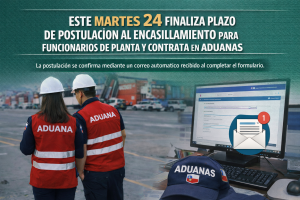 Se informa a las y los funcionarios del Servicio Nacional de Aduanas, tanto de planta como a contrata, que este martes 24 finaliza el plazo para postular al proceso de concurso interno de encasillamiento, etapa clave dentro de la implementación de la nueva estructura funcionaria institucional.